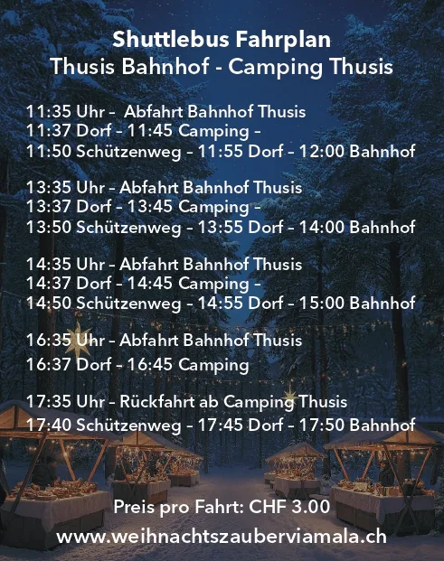 Am besten reist du mit dem ÖV an. Ab dem Bahnhof Thusis ist der Weg zum Markt mit Laternen signalisiert. Du kannst auch einen Shuttlebus nehmen gemäss den Abfahrtszeiten.